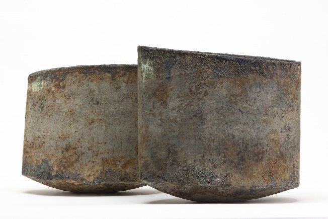 This particular body of work, charts a journey through a year of exploration. It reveals something of the process of spending time observing and walking the Ceredigion coast. Activity that had a dramatic effect on Paul’s spirit, energising him physically and creatively. This vital experience will continue to filter through Paul’s drawing and sculpture into the future. For now, the evolution from wide, elliptical, painterly surfaces to tilting, dark and encrusted forms is a vivid development. Paul’s vessels have long been elevated, a definitive trait that gives his work a sense of rising or being lifted. Add to this the shifting angles of his most recent works, particularly those that lean in pairs, and the energy of his vessels is on the move.