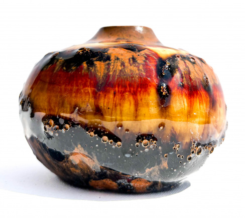 Her latest series is a study in controlled unpredictability, combining glaze chemistry with the spontaneous dynamics of the kiln to produce organic, evolving surfaces. Each palm-sized vessel is carefully thrown, trimmed, and offered as a canvas for the glaze to react and transform—inviting a quiet, tactile connection between object, viewer, and the natural environment.