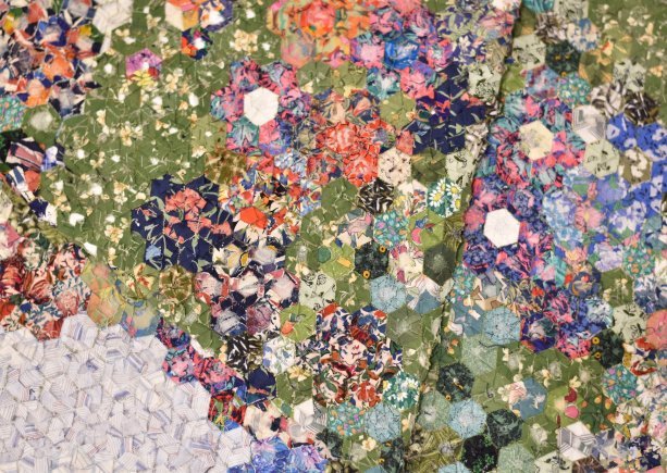 The piece shown is an incomplete quilt, one of the final projects Joyce undertook depicting water running into a lake (the water/lake area using her son’s outgrown shirt) surrounded by greenery. The quilt measures approximately 200cm x 150cm and consists of an estimated 4800 hexagon pieces 25.4mm (1 inch) wide, all paper pieced, hand sewn and constructed.
